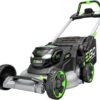The EGO POWER+ 21″ Select Cut XP Self-Propelled Mower delivers 8.3 foot-pounds of torque that exceeds the power of gas without the noise, fuss, or fumes. The Select Cut Multi-Blade Cutting System is equipped with three interchangeable lower blades: the Mulching Blade, High Lift Bagging Blade, and Extended Runtime Blade. The Mulching Blade comes installed on the lawn mower and is ideal for weekly mulching, giving you the mulching quality expected from a high-end gas lawn mower. The High Lift Bagging Blade provides extra suction ideal for bagging, leaving your yard free of clippings. The Extended Runtime Blade provides an optimal balance of cut quality and runtime for all around performance. All three blades can be used interchangeably based on your desired cut. The Upper Blade is used in combination with the lower blade chosen to slice the grass into fine fragments, greatly enhancing cutting performance with all grass types. EGO Touch Drive self-propelled technology puts complete control of the self-propel system in the palm of your hands by using pressure to engage the system. Easily control the variable speed with a dial positioned at your fingertips for safe and convenient operation. The Select Cut XP cordless lawn mower harnesses the power of the industry’s most advanced 56V ARC Lithium batteries to deliver up to 75 minutes of runtime on a single charge with the recommended 10.0Ah battery (available separately). Three-in-one functionality delivers your choice of mulching, side discharge, or bagging your grass clippings; an easy-access two-bushel grass collection bag is included. This electric lawn mower includes bright LED lights for added visibility when mowing at dawn or dusk, and it folds for compact storage between cuts. Experience Power Beyond Belief with the EGO POWER+ 21″ Select Cut XP Self-Propelled Lawn Mower.