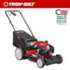 Make mowing the lawn fun again with your Troy-Bilt 21 in. 140cc Gas-Powered 3-in-1 Push Lawn Mower. This walk behind mower has a 140cc Briggs & Stratton ReadyStart engine with simple no prime, no choke starting. A 1.9 bushel rear bag collects grass clippings for easy clean up or composting. Each 3-in-1 walk behind mower features a high performance blade that creates lift for a finer cut. The symmetrical deck design improves airflow and works with the blade to cut clippings more times, producing a finer mulched cut. Backed by a 2 year limited warranty.