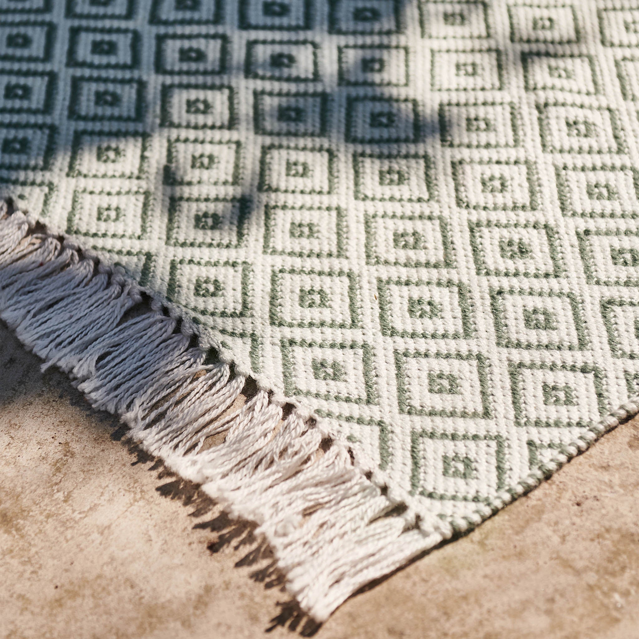 Für unsere Kollektion Barota werden PET-Flaschen aus Polypropylen auf umweltfreundliche Weise wiederverwertet: Sie werden gesäubert, zerkleinert, geschmolzen und schließlich zu Garn versponnen. Aus diesem webt unser Partner in Indien langlebige Läufer für den Innen- und Außenbereich, die sich fast so weich wie Wolle anfühlen. Dank des wasserabweisenden Garns trocknet Barota schnell und ist ausgesprochen leicht zu reinigen. Das zeitlose Diamantmuster mit Fransen ist wendbar, sodass Sie sich nach Belieben für eine der beiden Seiten entscheiden können. Mit der Zeit kann sich die Farbgebung durch starke Sonneneinstrahlung leicht verändern.