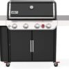Weber Black Genesis Grill includes PureBlu burners with a unique, tapered design, creating a consistent flame and even heat across the grilling surface; Raised flame openings keep food debris falling away, minimizing clogs and corrosion